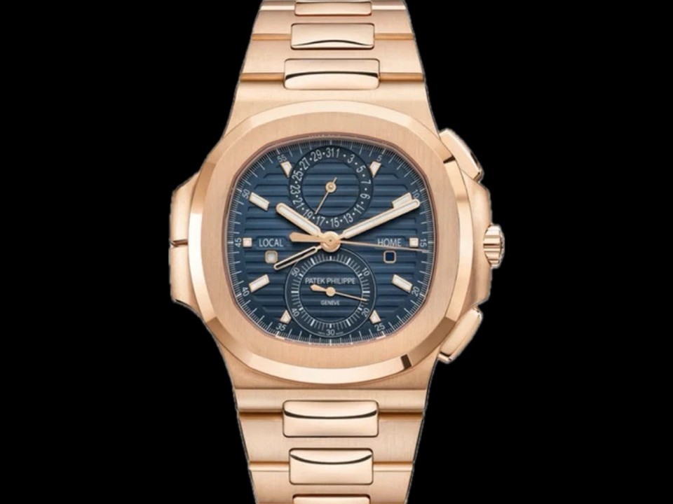 Patek Philippe 百達翡麗 Nautilus 金鷹系列 鸚鵡螺 5990/1R-001 18K玫瑰金材質 鍊帶款 藍色日輝紋水平橫紋浮雕面盤 飛返計時 GMT兩地時間