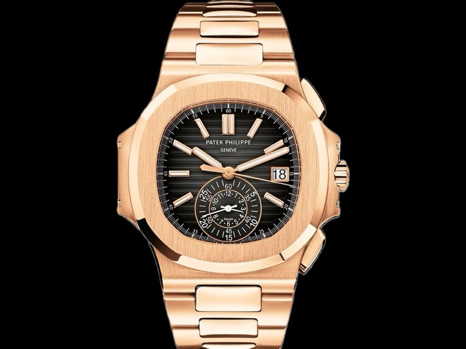 Patek Philippe 百達翡麗 Nautilus 金鷹系列 鸚鵡螺 5990/1R-001 18K玫瑰金材質 鍊帶款 藍色日輝紋水平橫紋浮雕面盤 飛返計時 GMT兩地時間
