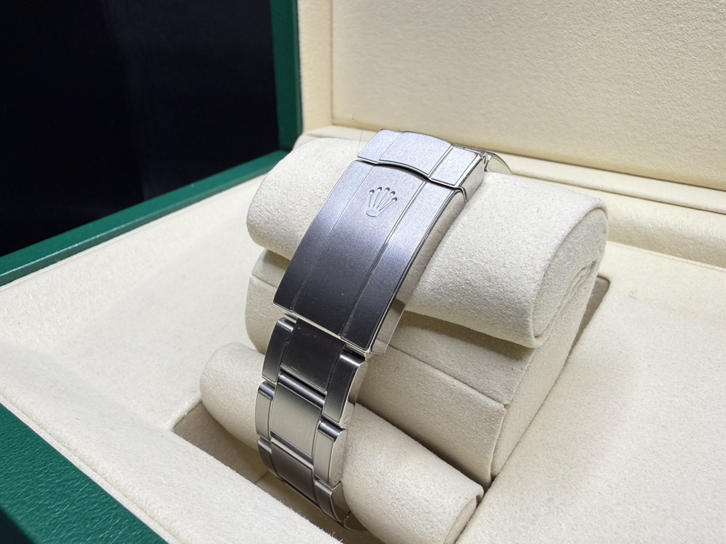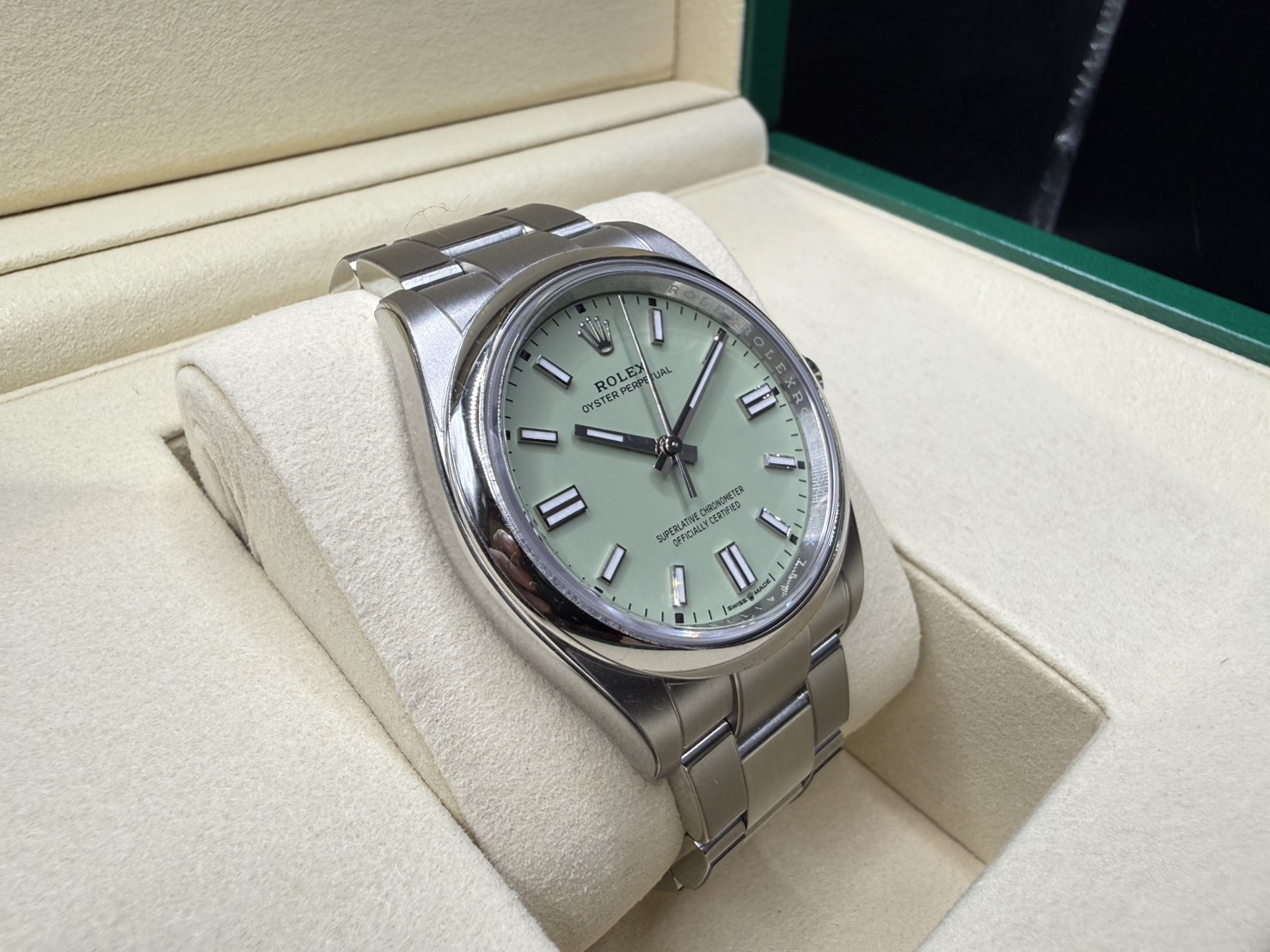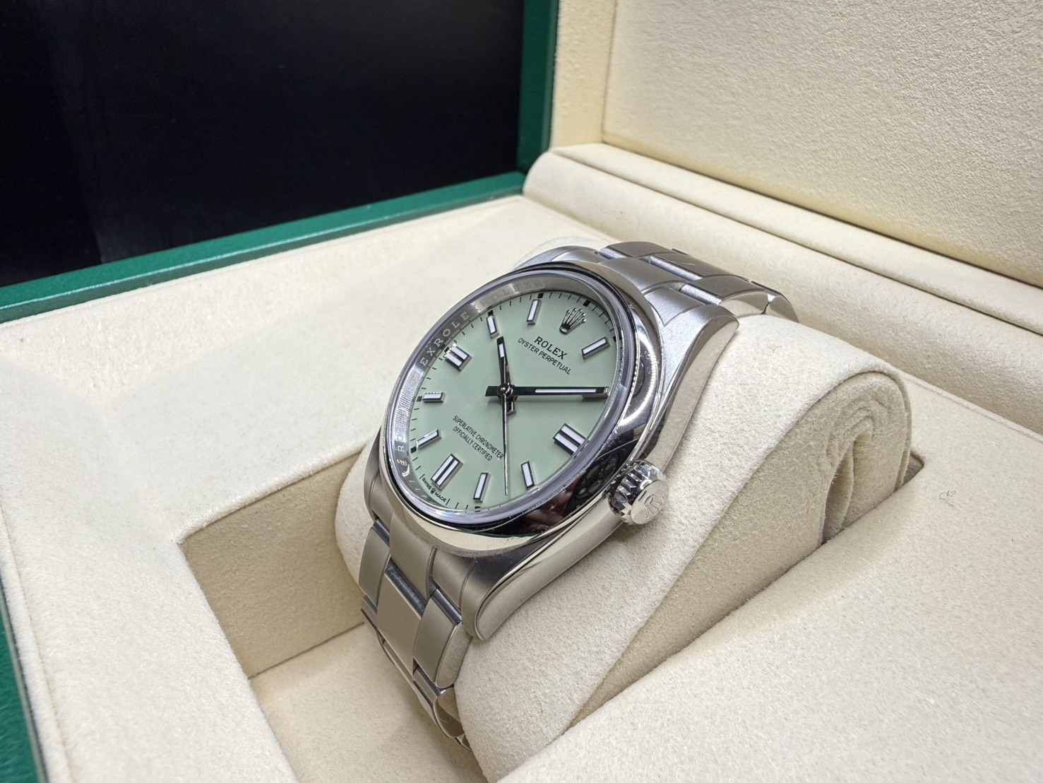 904L不鏽鋼材質錶殼、蠔式錶帶及折疊帶扣 / 開心果綠色面盤 / 立體夜光時標及指針 / 旋入式錶冠 / 藍寶石水晶玻璃鏡面 / 防偽內圈 |