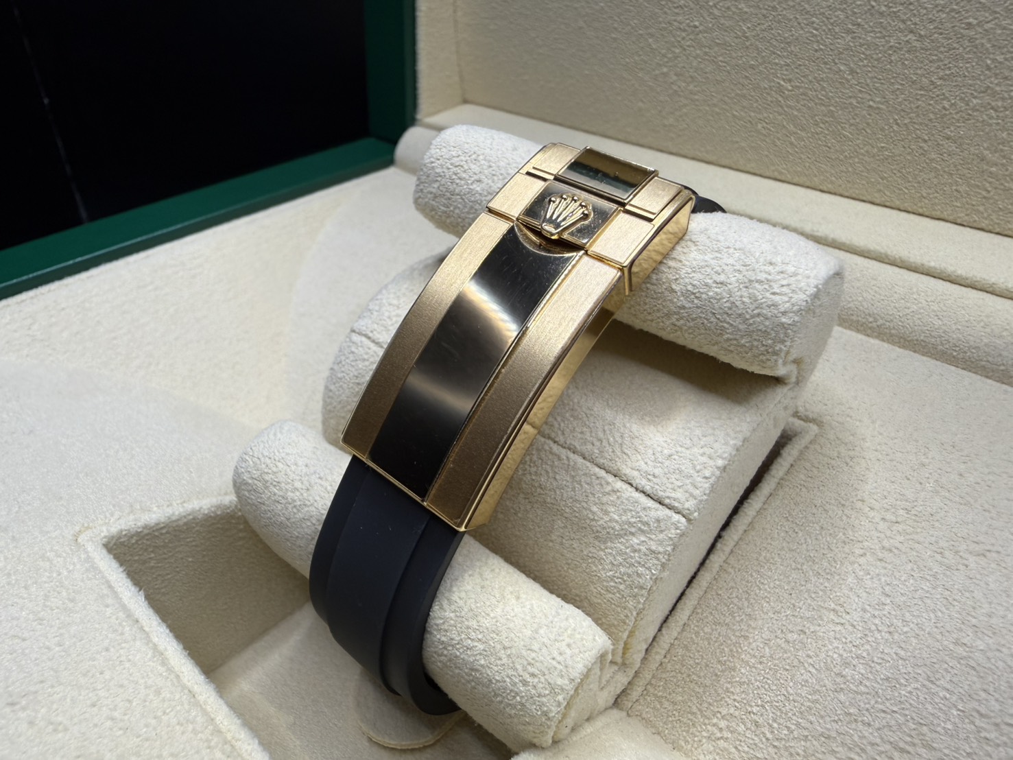材質: 黃K金材質錶殼、錶帶、摺疊扣、旋入式錶冠 / Cerachrom黑色陶瓷視距儀刻度錶框 / 黑底黃金圈熊貓面盤 / 夜光指針 / 原廠勞力士新式黑色橡膠錶帶 / 藍寶石水晶玻璃鏡面 / 防偽內圈