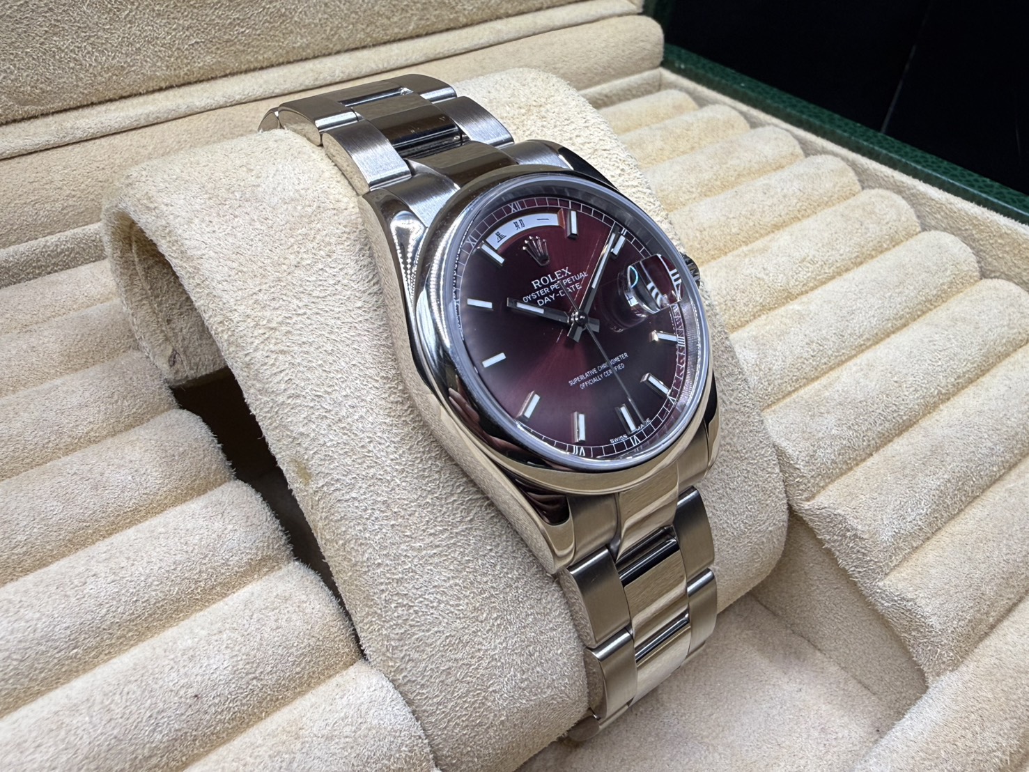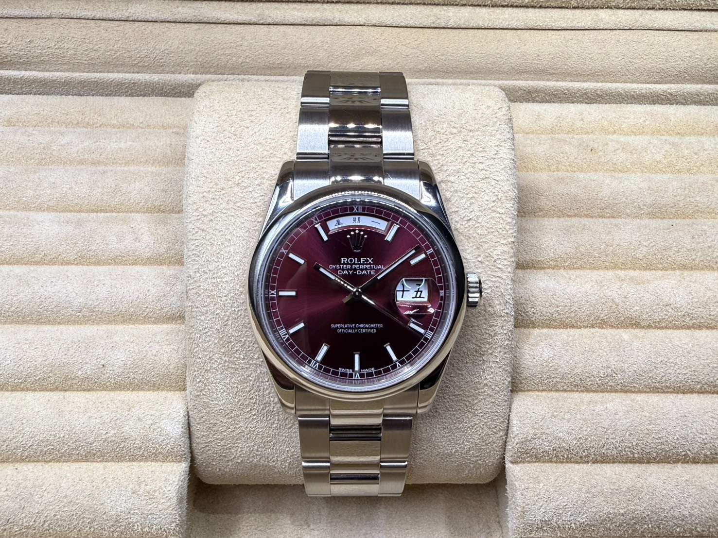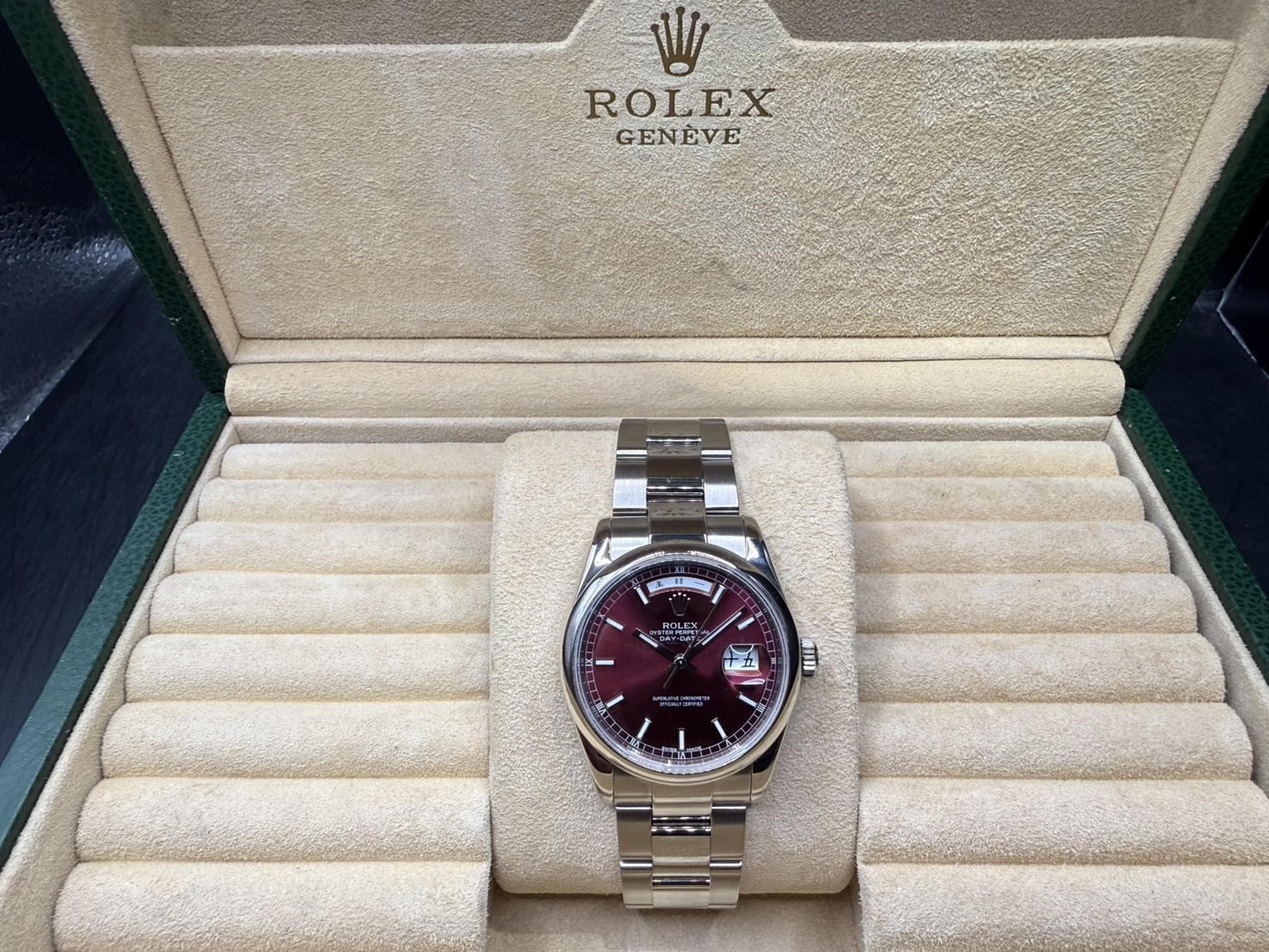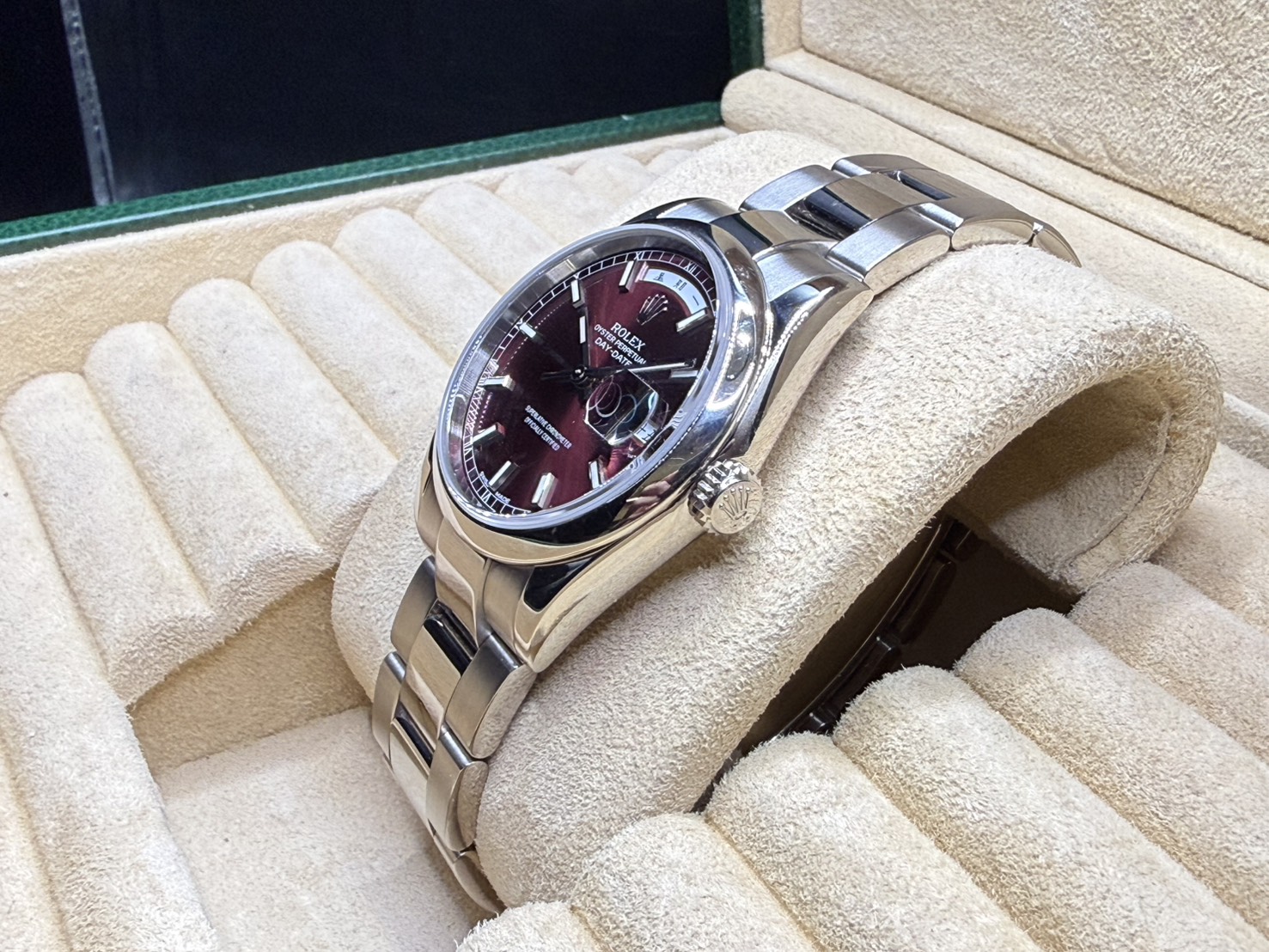 ROLEX 勞力士 Oyster Perpetual Day-Date 36 蠔式 星期日期型 118209 18k白金 櫻桃紅面盤 雙卡 原廠保固2年
