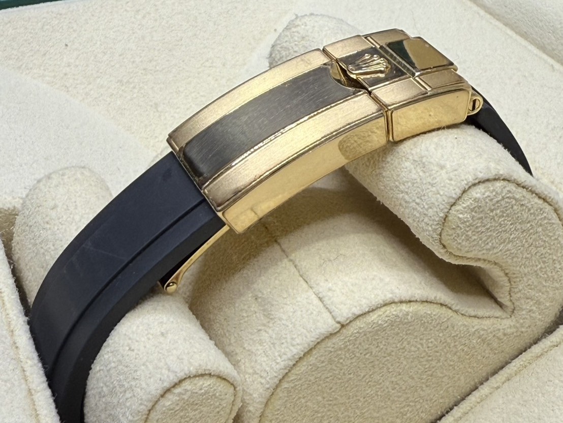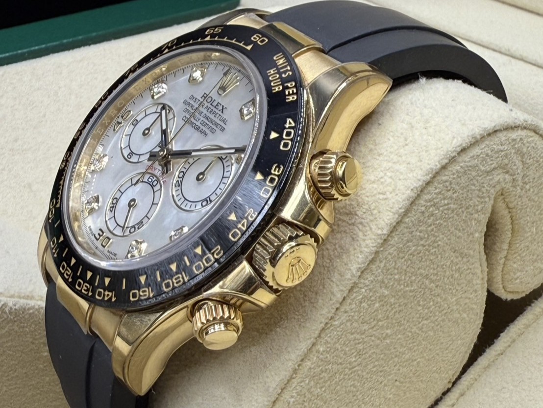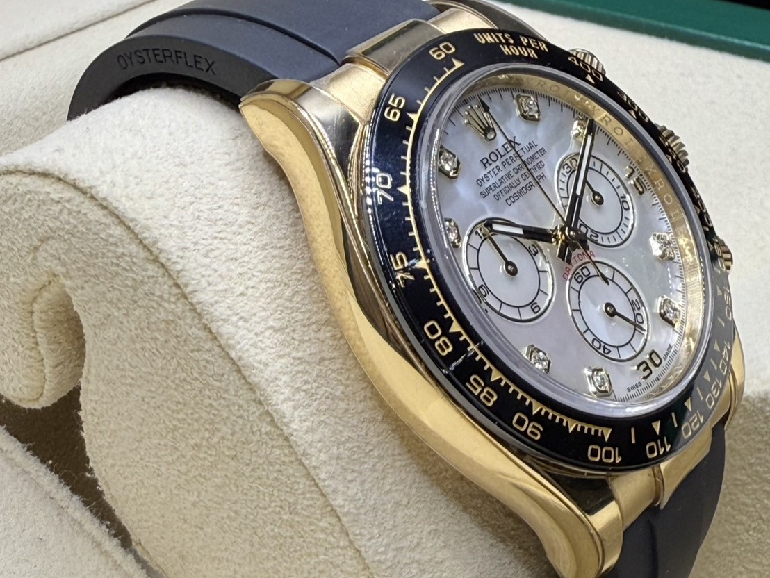 材質: 黃金材質錶殼/膠帶及摺疊帶扣 / 白色貝母面盤 / 黑色Cerachrom陶質字圈連鑄模測速計 / 夜光指針及時標 / 旋入式錶冠及計時按把