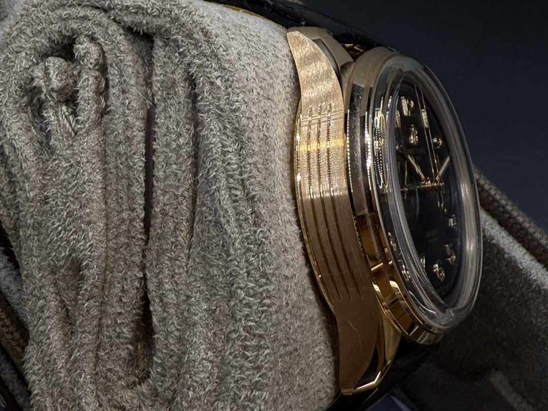 不鏽鋼錶殼、穿扣 / 原廠黑色鱷魚皮皮帶 / 藍寶石水晶玻璃鏡面 / 柱狀時標 / 夜光指針 |