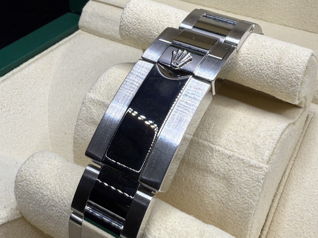 勞力士原廠3186自動上鍊機芯,黑色面盤,黑色陶瓷錶圈,夜光時標及賓士指針,不鏽鋼鍊帶及摺疊帶扣,旋入式錶冠,藍寶石水晶玻璃鏡面 |