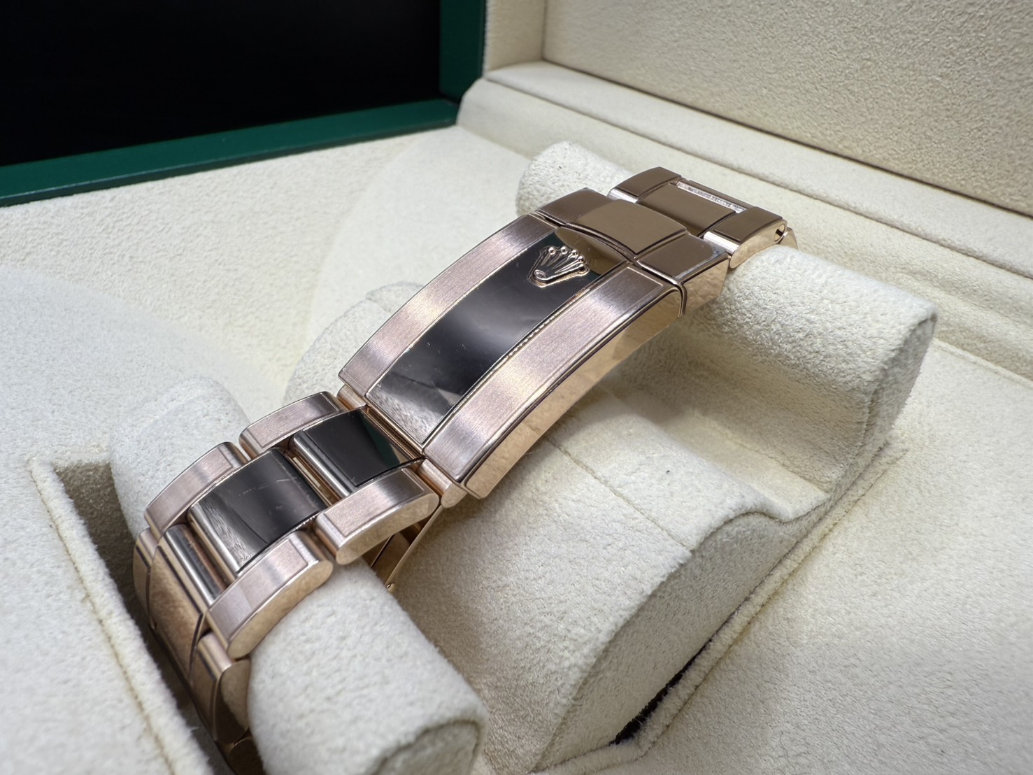 18K玫瑰金材質錶殼、五株錶帶、摺疊帶扣、旋入式錶冠 / 藍綠色面盤 / 夜光指針及柱狀時標 / 紀念型(Jubilee)錶帶 /Ring Command雙向旋轉白K金材質外圈 / 藍寶石水晶玻璃鏡面 / 防偽內圈 |