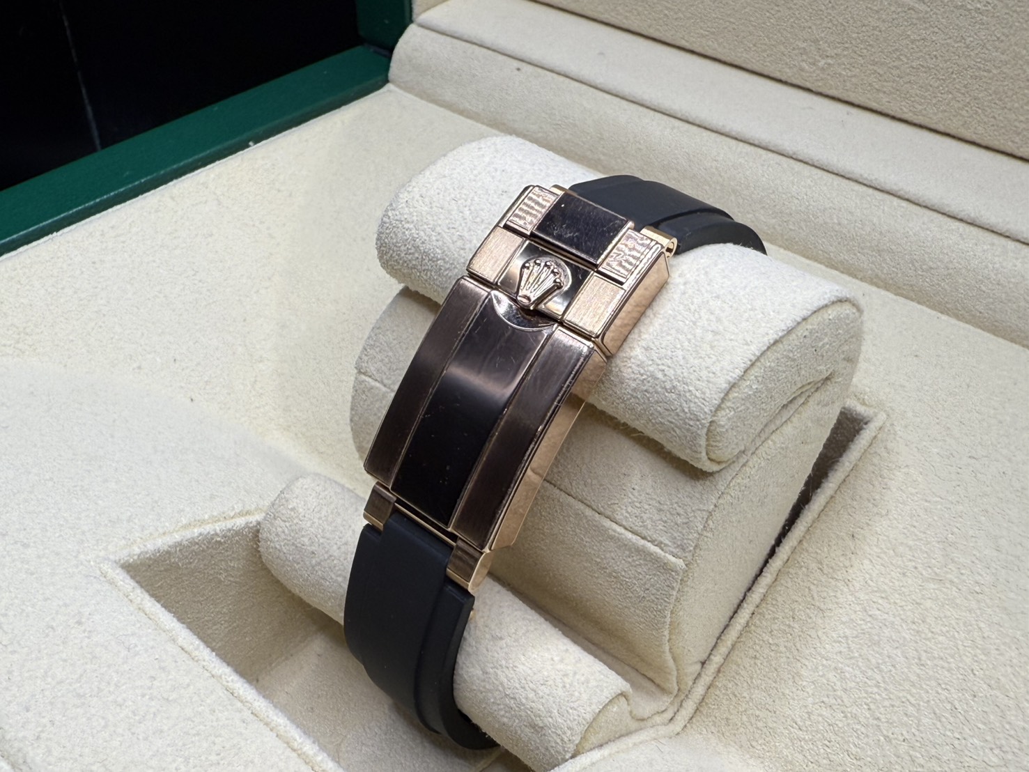 18K永恆玫瑰金材質錶殼、計時按把、摺疊帶扣 / 原廠橡膠錶帶 / 抗磨損藍寶石水晶玻璃鏡面 / 防偽內圈 / 實底蓋 / 旋入式錶冠 / 黑色陶瓷錶圈