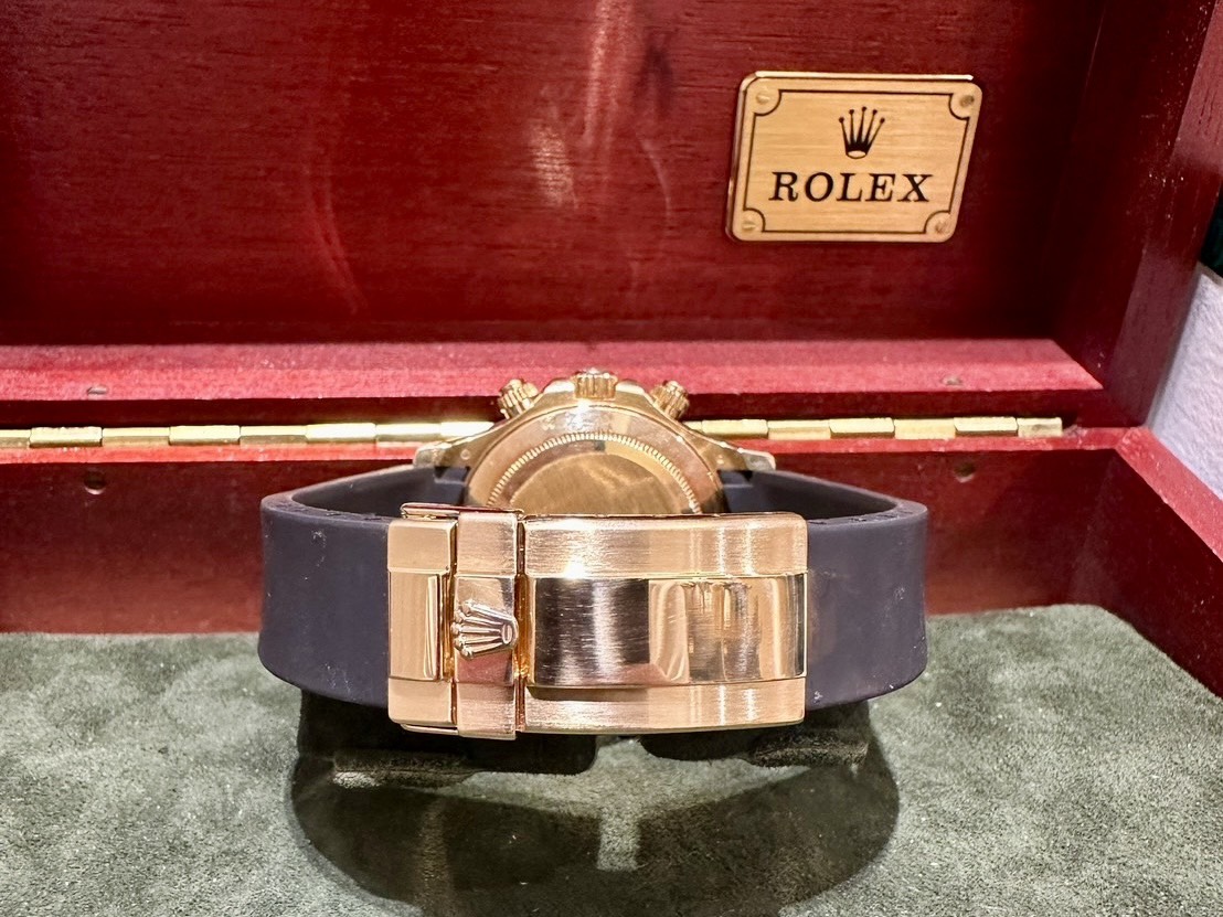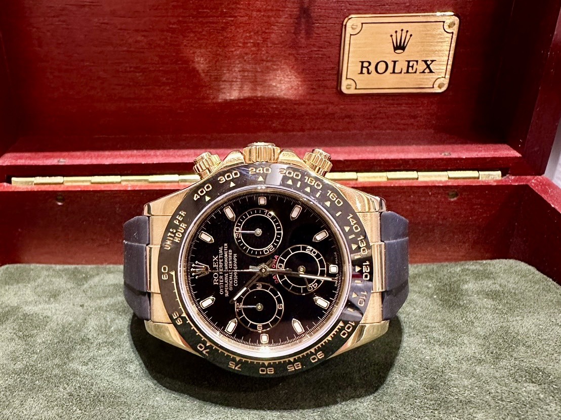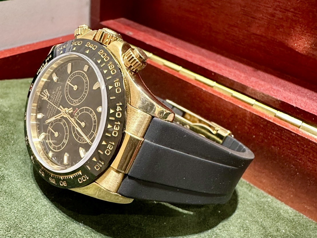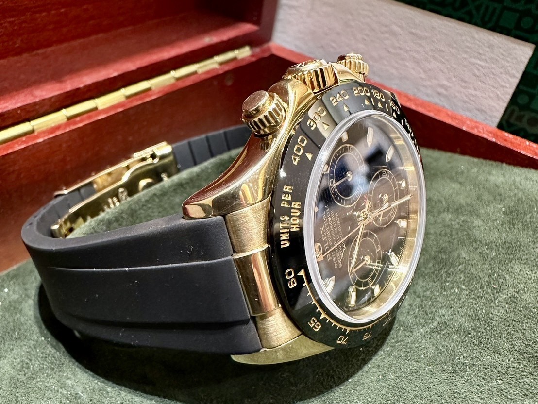 材質: 18K黃金錶殼、摺疊扣、旋入式錶冠、計時按鈕 / 黑色陶瓷測速計刻度錶圈 / 原廠黑色Oysterflex橡膠錶帶 / 藍寶石水晶玻璃 / 實底蓋